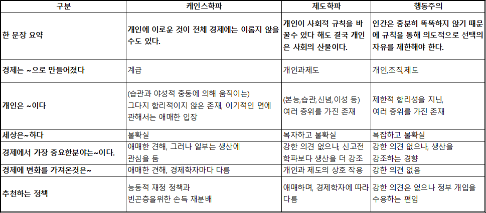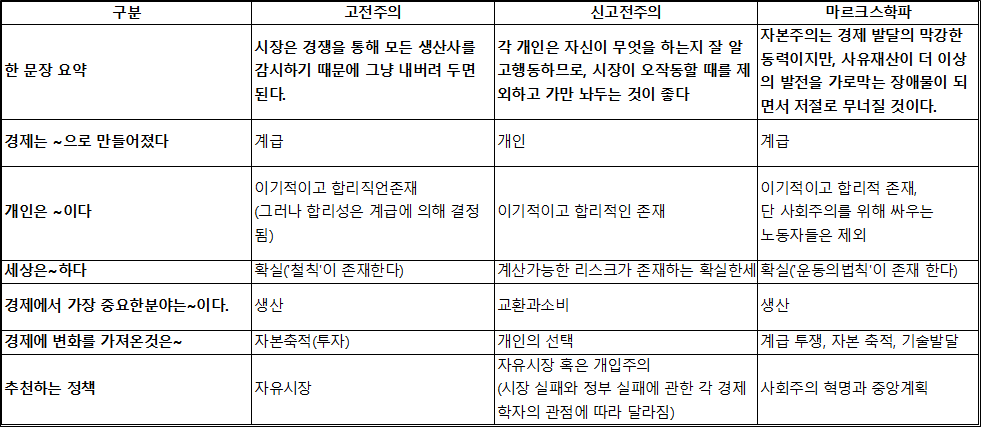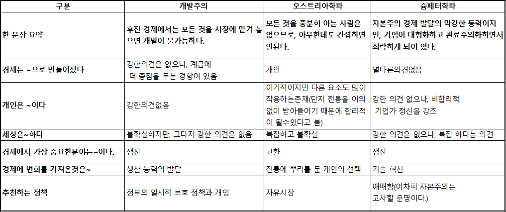 고전주의, 신고전주의, 마르크스학파, 개발주의, 오스트리아학파, 슘페터학파, 케인스학파, 제도학파, 행동주의